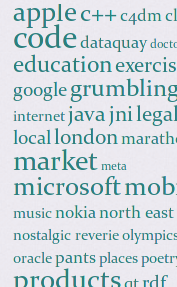 As I write this, the tag cloud for this blog looks like the picture on the left—Apple and Microsoft loom large, Nokia and Oracle get a look in, and there’s no reference to Linux at all.