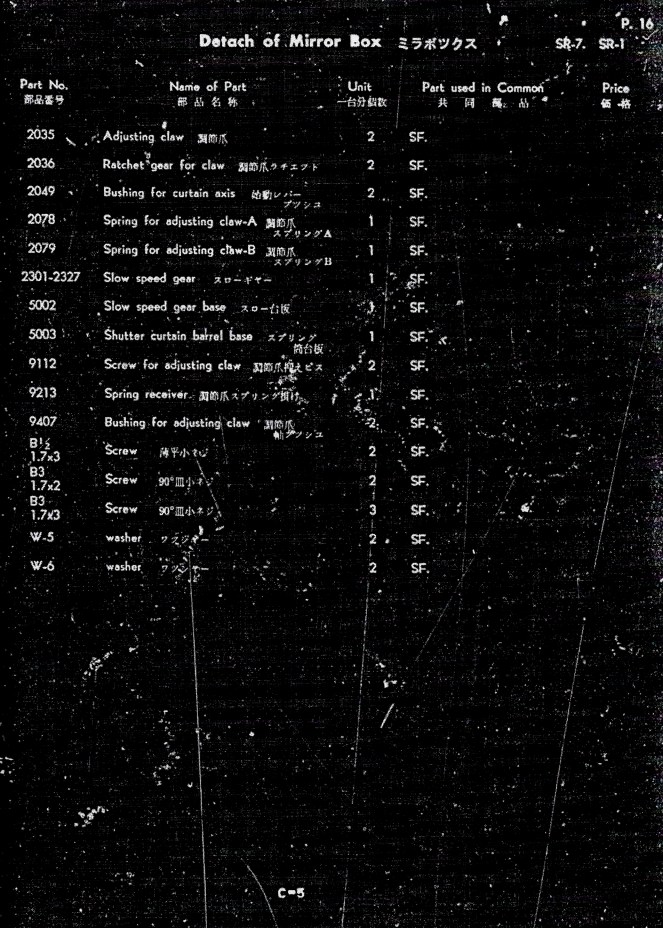 I tried a company that sells paper copies of old manuals; they listed two repair manuals for the SR-1, identified as “older version” and “newer version”. I emailed asking whether this referred to the version of the camera or of the manual, and they replied that they couldn’t tell me because they had lost the older one: it existed only on microfiche, to be digitised on demand, but their reader had broken down before anyone had ordered it.