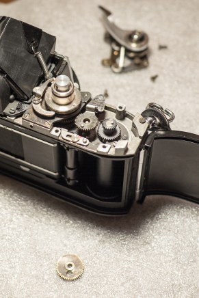 - Wind the shutter a little bit so as to move the pin on the mirror kick gear out of the way, then put the mirror box back in (may take some patience to get the mirror lever through the base properly) and screw down