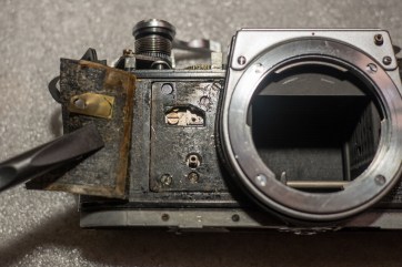 The front plate consists of the entire lens mount and two metal “wings” either side of it, beneath the leather, one of which (in picture) has the self-timer attached to its back. The plate is held on by four screws, one at the top and bottom of each wing. Remove these and the front plate then lifts off.