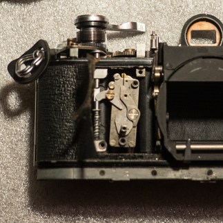 When replacing the front plate, put it gently in place first and then press the shutter button a couple of times to make sure the self-timer lever settles into place in the cutout of the shutter release shaft (see picture under the self-timer section below) before trying to fasten it down. Don’t tighten the screws without being sure the self-timer lever is properly settled, or you might damage it.
