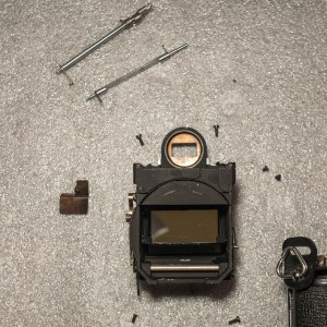 - Remove the eyepiece, top controls, top and bottom covers and the front plate; put the winding lever back on