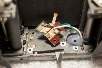 Neither plate is easy to remove and replace. The winding plate is easy to remove, but it takes some trial and error to replace it with the right orientations for the gears beneath. The speed change plate can’t be removed without detaching the lever at the top of the slow-motion axis, which I think then can’t be re-attached at the correct angle without access to the lever at the other end of the axis, which is down where the slow speed gear lives, under the baffle at the bottom of the mirror box.