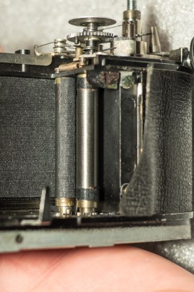 - At the top of the camera, lowering the shutter release shaft disengages the winding gear from the transmission and makes space for the fast-speed shutter lever to move in against the first curtain gear if an appropriate speed is selected.