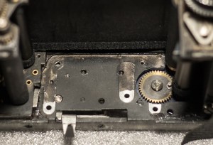 The slow-speed gear or governor is a self-contained module that lives beneath a black-painted metal baffle at the bottom of the mirror box. You can see it at the bottom of the picture above, which shows the landscape with the mirror box removed.
