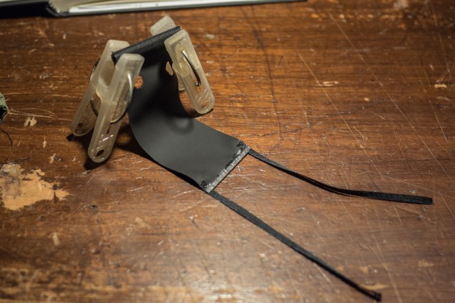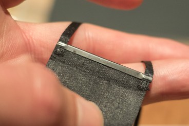 - Sew a small strong square of black cotton through each of the tapes’ contact areas (I did it by hand but you could do it with a machine if you knew how)