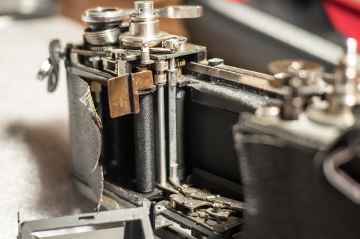 The leather is thin in comparison to later cameras, tears easily, and is well stuck down with both glue and tape. It’s not that easy to lift, and it wouldn’t stick back down again without new adhesive, but I did find the texture quite good at hiding mistakes afterwards.