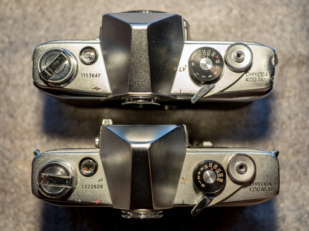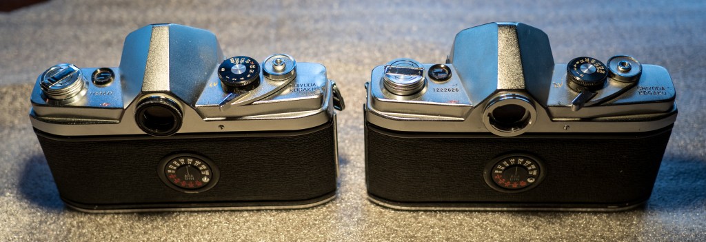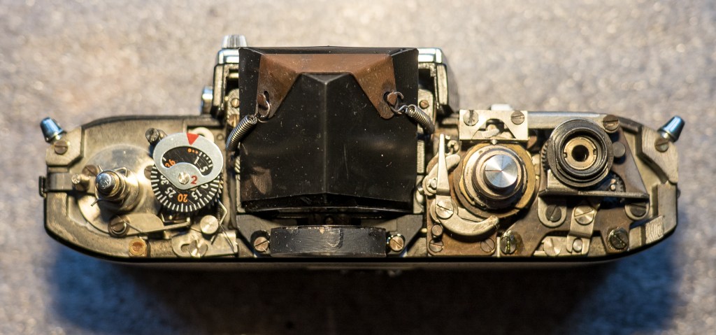 This camera also had a non-working slow-speed gear, which just needed cleaning, and a loose mirror box and viewfinder, due to having somehow lost one of the screws attaching the mirror box to the bottom plate. With these fixed, it’s working again, as is the other camera which came to me with a stuck shutter. In both cases the faster shutter speeds still need a bit of adjustment, and I haven’t yet run any film through them.