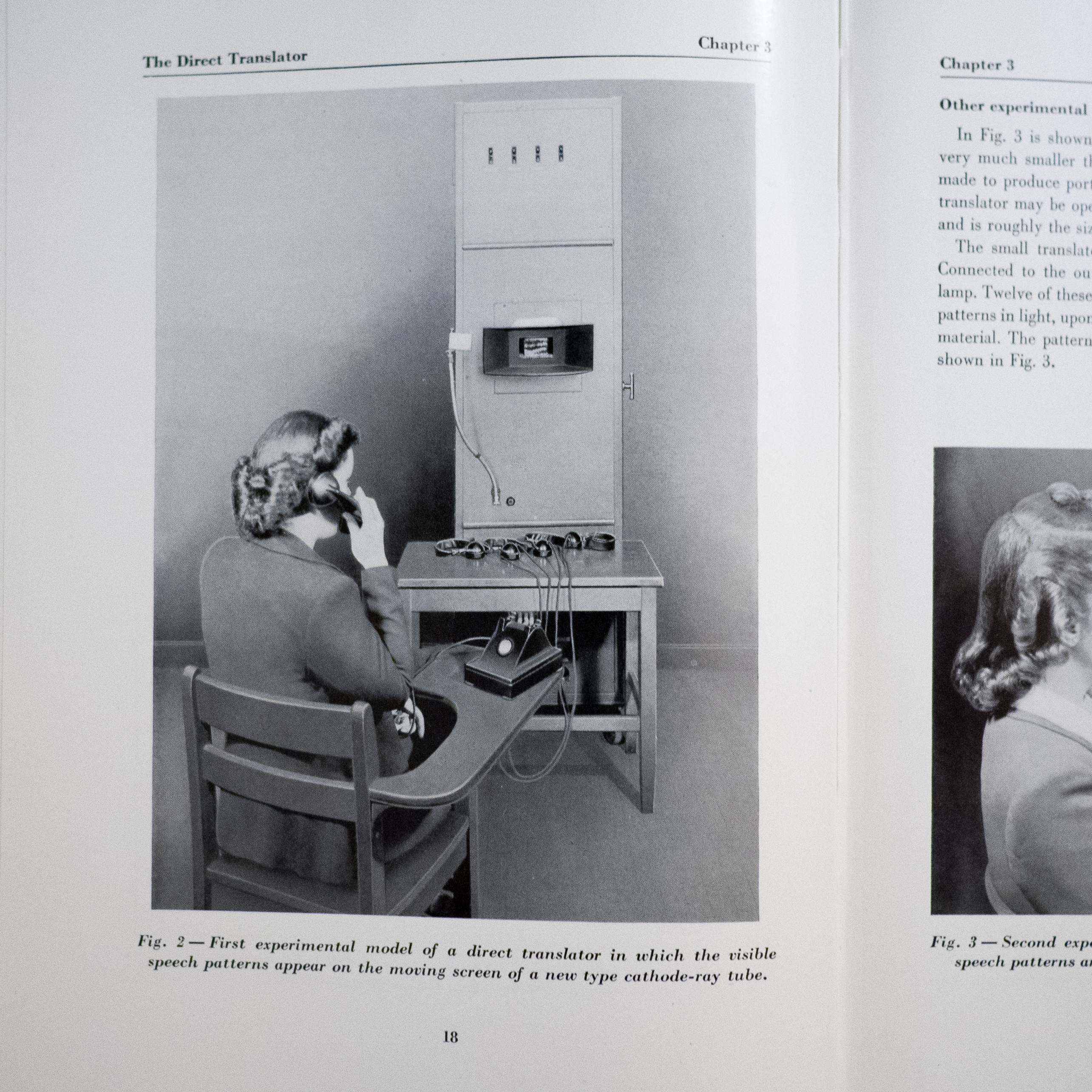 The authors of the 1947 book were writing about work done at Bell Labs to try to make the telephone accessible to the deaf. Their experimental devices used paper tape or phosphor display to show spectrographs of the speech sounds, and users were specially trained to interpret speech from them. Here’s a picture from the book of someone using one.